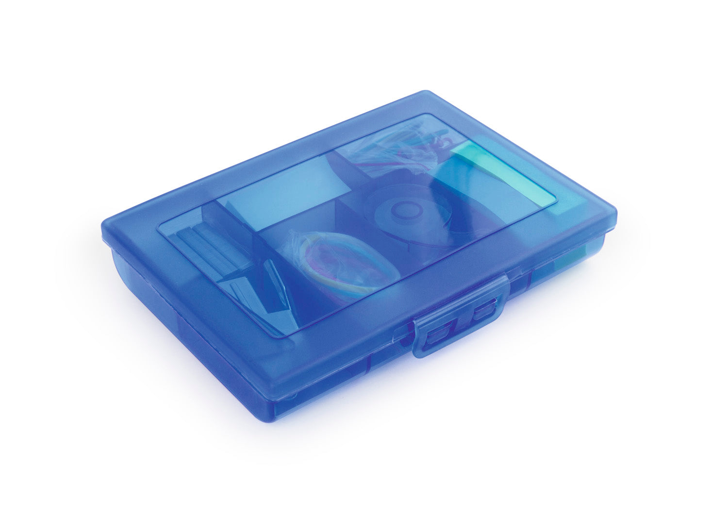 Estuche plástico que contiene: Cosedora, ganchos de repuesto x 5, dispensador de cinta adhesiva, clips: 4 unidades en cinco colores diferentes, 15 bandas de caucho en colores y 4 juegos de banderas de papel adhesivas por 80 hojas cu. Un juego de memos por 60 hojas.. Area impresion: 6 x 4,5 cm. . Medidas Largo: 2.50 . Medidas Ancho: 12.00 . Medidas Alto: 8.50