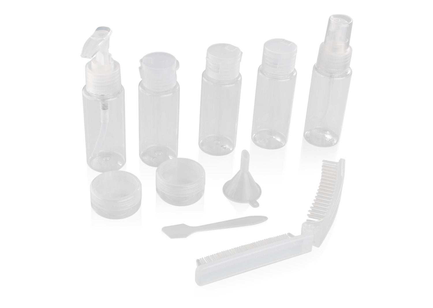 Set de botellas de plástico para viajes hechas en PETPP. Ideales para transportar líquidos y cremas con facilidad, protegiendo la higiene de los productos.. Area impresion: Tampo Estuche: (7 X 4). Tampo Envase: (4,5 X 1,5). . Medidas Largo: 4.5 . Medidas Ancho: 18.8 . Medidas Alto: 13.4