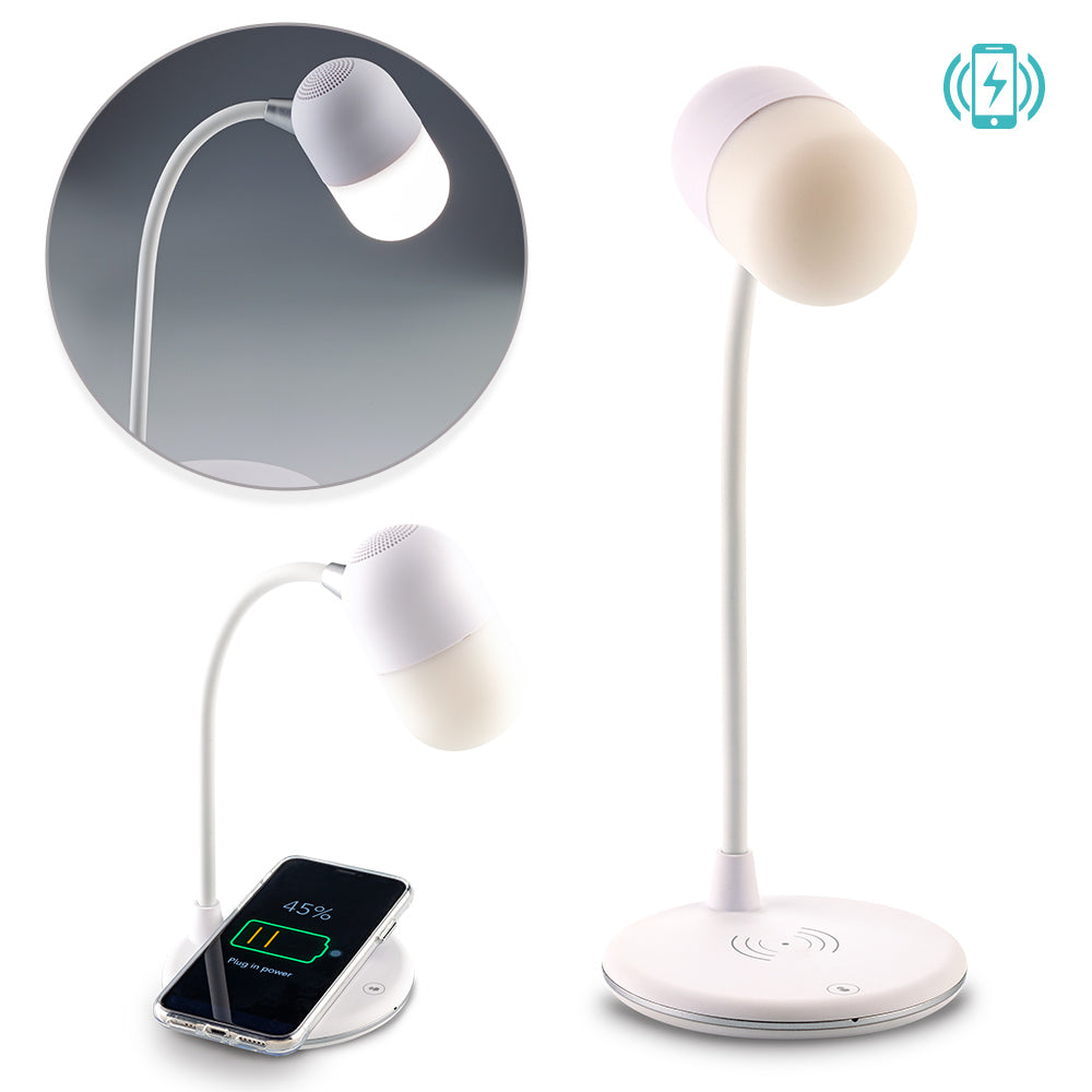 Lámpara de escritorio, 7LEDs con luz blancaamarilla, speaker 1x3W y cargador inalámbrico de 10W debe conectarse con el cable provisto. Empaque caja individual. Medidas Base: 12 cm diámetro Marca: 5 cm Tampografía Lo que debe saber: Este artículo transmite la energía y NO acumula carga para llevar, funciona siempre y cuando esté conectado. Sirve únicamente en dispositivos móviles que vengan desde fábrica con la funcionalidad de carga inalámbrica. Nota Importante La tecnología de carga inalámbrica funciona con los dispositivos móviles compatibles con esta funcionalidad; se recomienda buscar en las especificaciones de su dispositivo móvil y en el manual de uso que puede descargarse para cada marca y modelo, si su dispositivo es compatible. Se recomienda retirar el forro protector de su móvil y cualquier otro elemento que genere interferencia cuando se coloque a cargar.