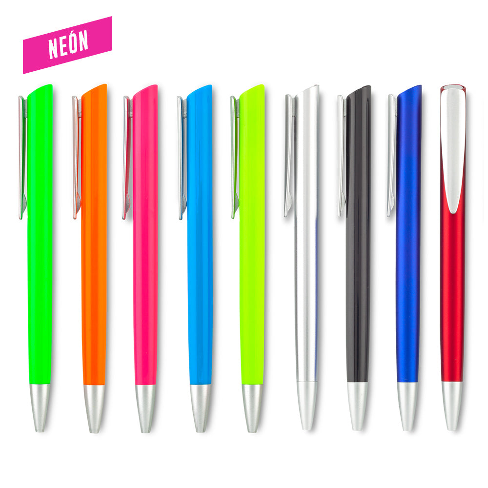 Bolígrafo plástico con acabado metalizado o neón. Mecanismo push. Medidas:14 cm Marca:4 cmTampografía Venta mínima y en múltiplos de caja de 50 unidades.