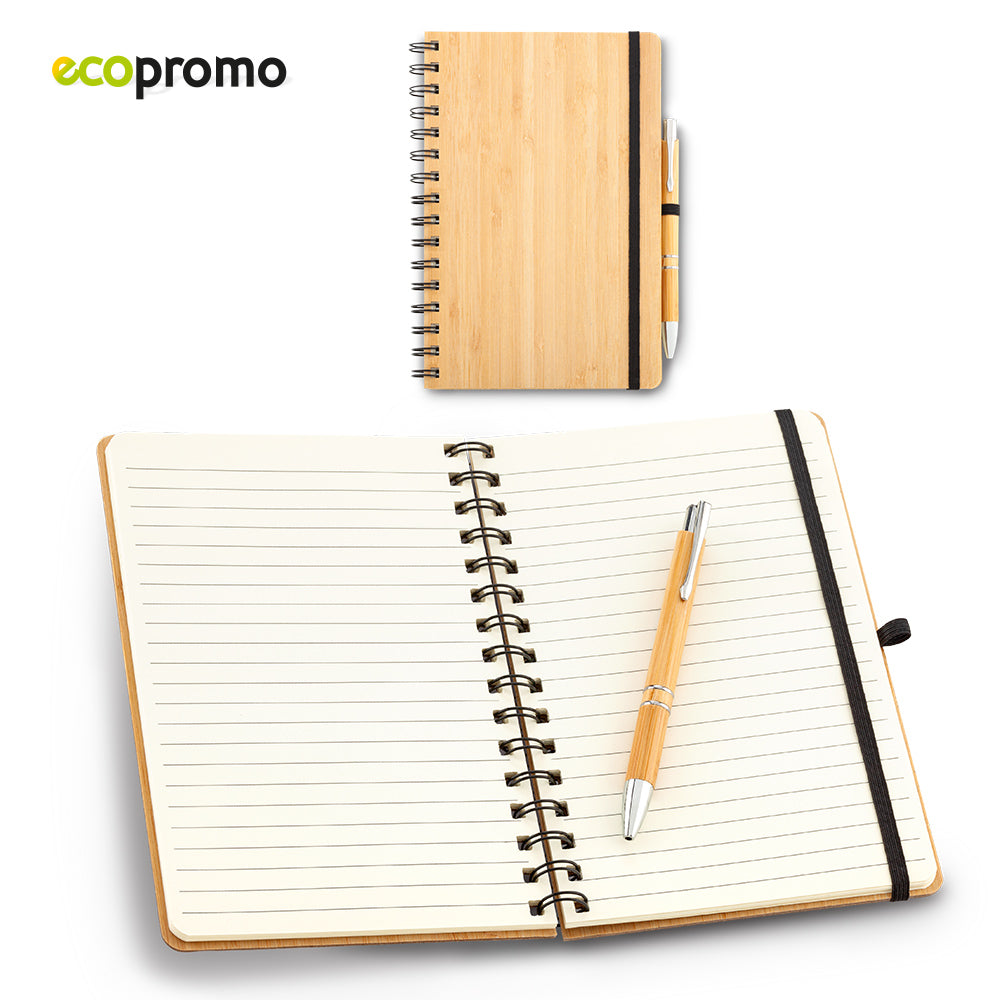 Libreta de 80 hojas de 70g de papel natural con rayas, cubiertas en bambú con cierre elástico, Incluye bolígrafo ecológico con barril en bambú y partes en plástico ABS, Mecanismo Push. Medidas: 14 cm x 21 cm x 1 cm Marca: 7 cm Láser