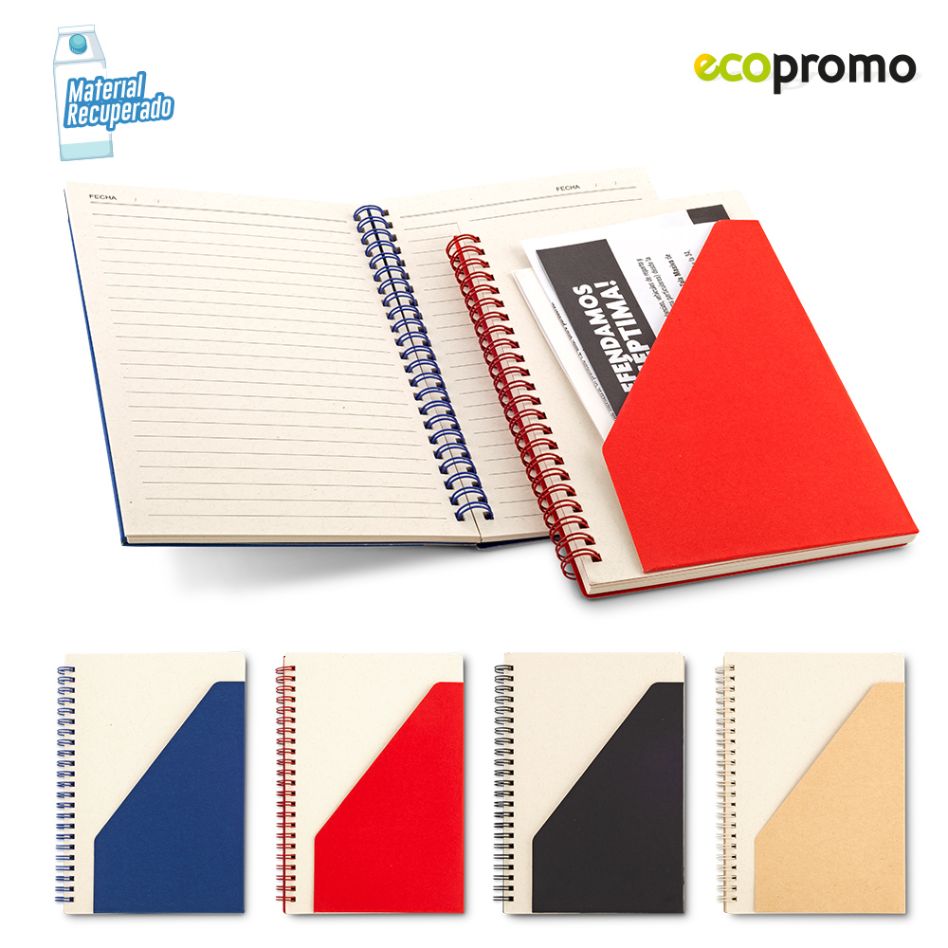 Libreta con cubiertas de cartón elaboradas en material recuperado a partir de cajas de leche. 70 hojas. Medidas: 14 cm x 21 cm x 1 cm Marca: 5.5cm Tampografía Ficha Técnica
