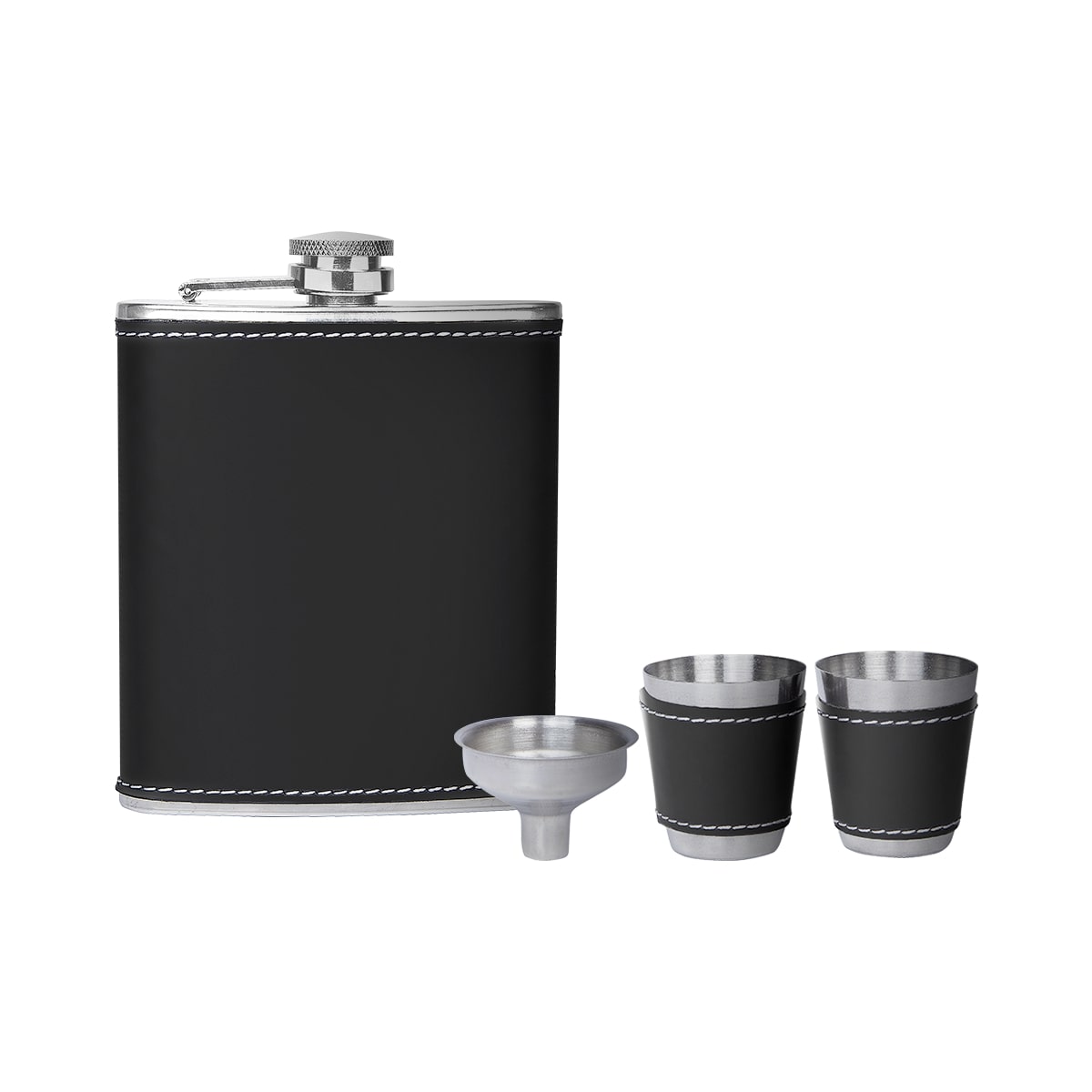 Set de licorera con tapa de rosca para evitar derrames, 2 vasos metálicos con manga de curpiel, 1 embudo y caja de regalo.. Medidas: 10 x 12.5 cm Licorera / 3.6 x 4 cm Vasos . Material: Acero Inoxidable / Curpiel