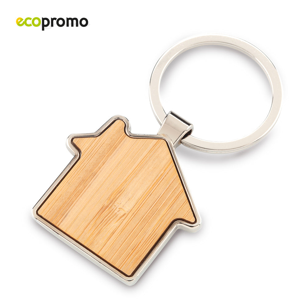 Llavero con forma de casa, combinación metal de acabado brillante y bambú. Empaque bolsa individual. Medidas: 4.4 cm x 4.3 cm x 0.4 cm Marca: 2 cm Láser Ficha Técnica