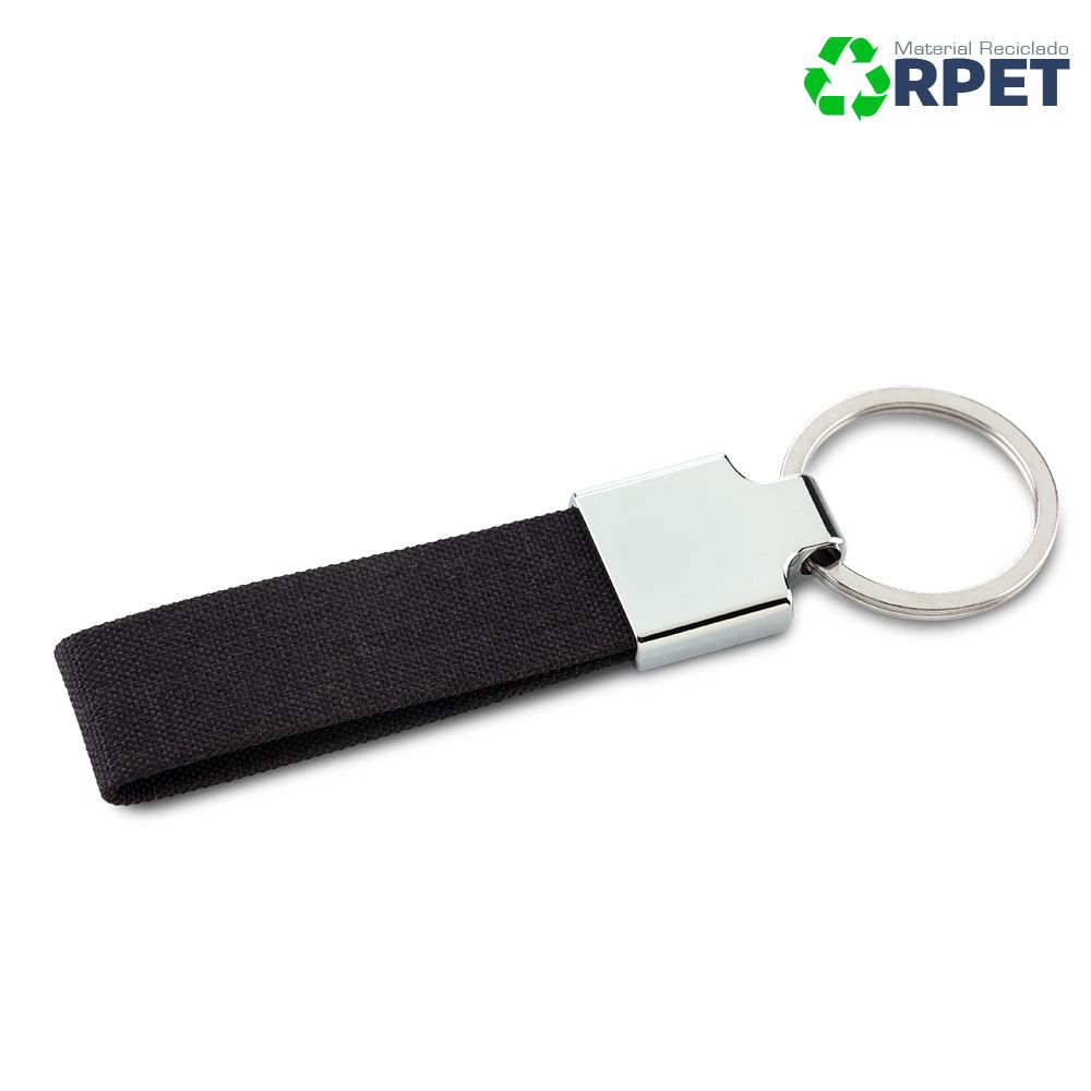 Llavero en poliéster reciclado RPET y metal. Empaque caja individual. Medidas: 12 cm x 3 cm Marca: 4 cm Tampografía