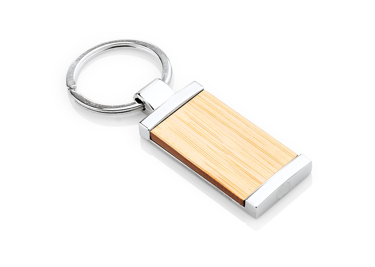 Llavero metálico rectangular con cubierta en Bambú. Area impresion: Láser: 2x2 cm - Tampo: 2,5cm . Medidas Largo: 0.40 . Medidas Ancho: 2.20 . Medidas Alto: 8.30