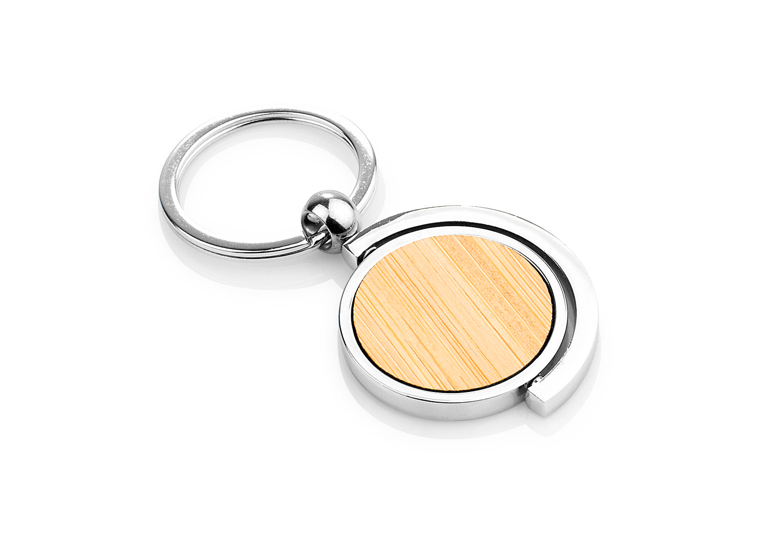 Llavero metálico redondo con cubierta en Bambú. Area impresion: Láser: 2x2 cm - Tampo: 2,7 cm . Medidas Largo: 0.40 . Medidas Ancho: 3.50 . Medidas Alto: 7.50