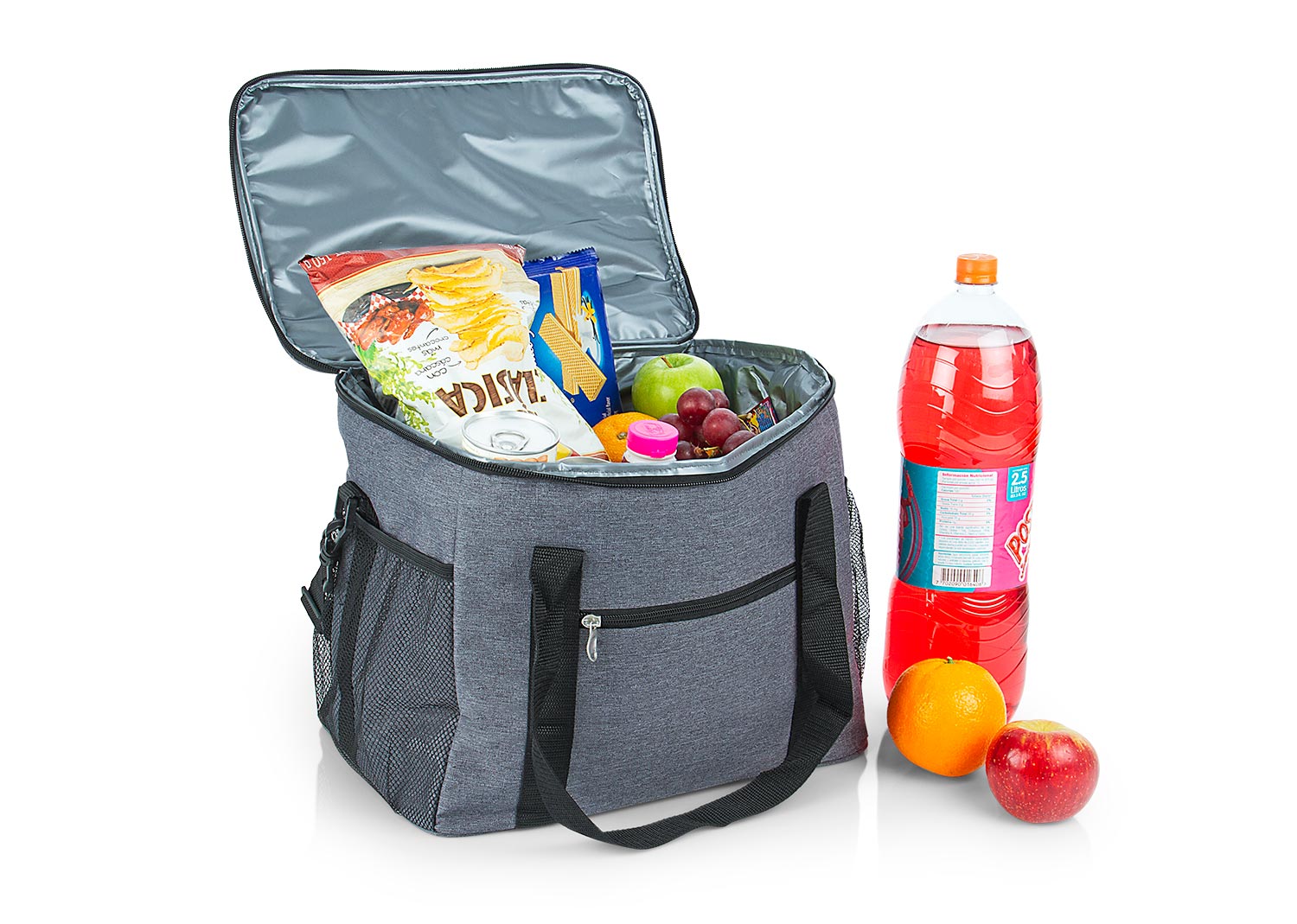Lonchera térmica con recubrimiento interior en PEVA que conserva las bebidas o alimentos fríos por más tiempo, bolsillo principal y frontal con cierre en cremallera y bolsillos laterales en malla. Con práctica agarradera de mano y cargadera larga ajustable.. Area impresion: 15 x 12,5 cm. . Medidas Largo: 25.00 . Medidas Ancho: 38.00 . Medidas Alto: 29.00