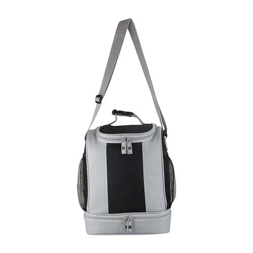 Interior plastificado. Cuenta con compartimentos superior e inferior con cierre. Incluye bolsas laterales de red, asa con broche y correa ajustable. Capacidad para 5 latas.. Medidas: 22 x 25 x 15 cm . Material: Poliéster