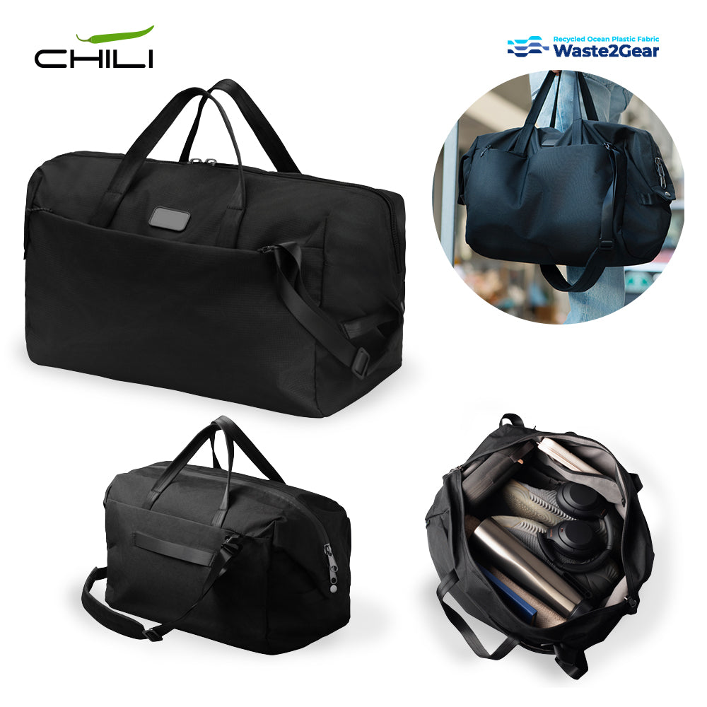 Maletín en poliéster reciclado de residuos plásticos recuperados del océano. Dos compartimentos con cierre de cremallera. Incluye placa metálica para marcar. Medidas: 52 cm x 32 cm x 22 cm . Marca: 3 cm Láser 10 cm Screen Más información acerca de Waste2Gear en https:www.waste2gear.org VIDEO