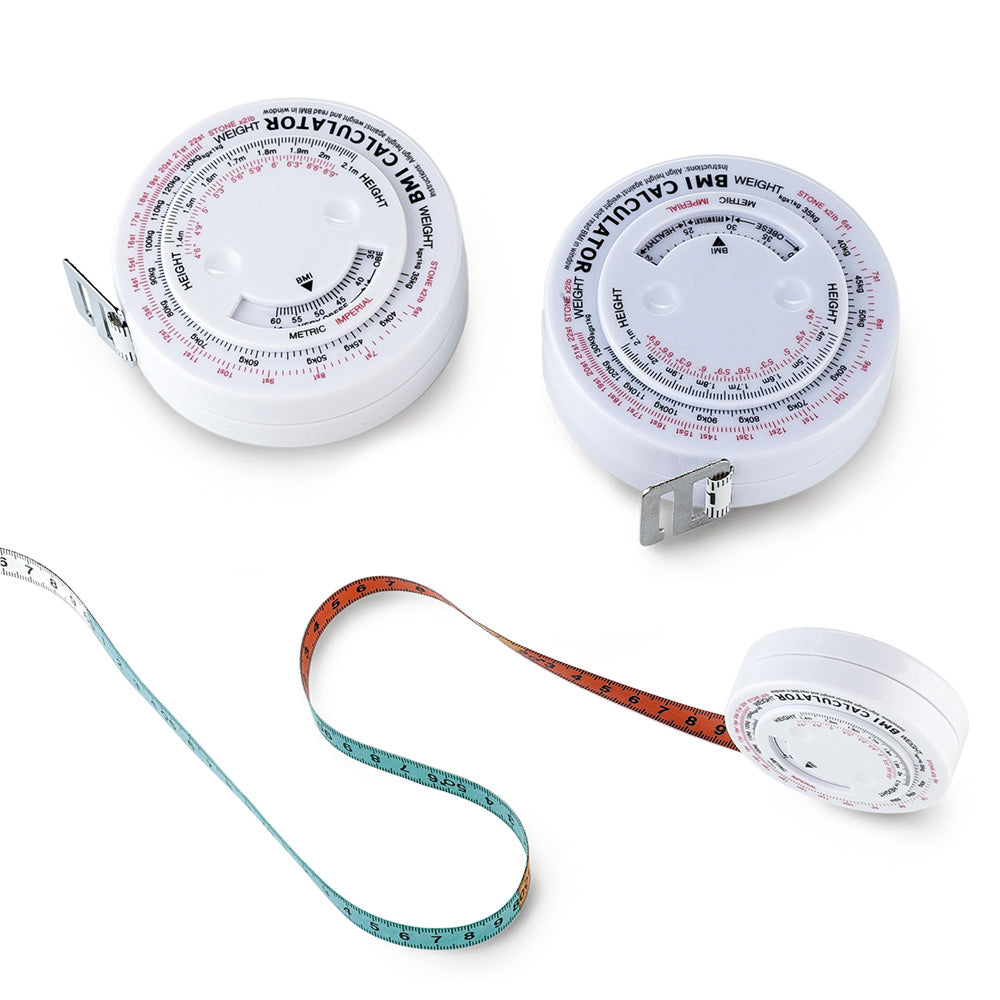 Metro en plástico para calcular el índice de masa muscular, con botón para recoger la cinta. Medidas: 7.3 cm diámetro Marca: 2.5 cm Tampografía - Producto complejo Ficha Técnica
