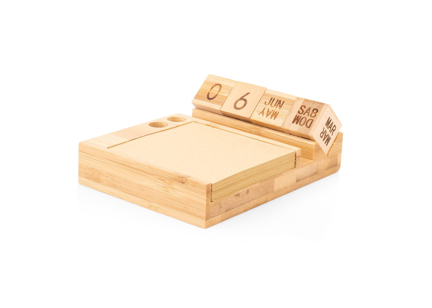 Porta notas de bambú con calendario perpetuo que muestra día, fecha y mes de forma continua, sin necesidad de reemplazo anual. Incluye 4 bloques giratorios de madera 2,3 X 2,3 X 2,3. Contiene 100 hojas de papel tipo kraft 7,6 X 7,6 y compartimentos para bolígrafos o accesorios. Diseño funcional y ecológico para escritorio.. Area impresion: Tampo: 4cm x 1cm. Láser:1,5 cm X 4 cm. . Medidas Largo: 2.6 . Medidas Ancho: 13.2 . Medidas Alto: 9.5