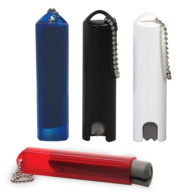 Estuche tubular plastico con argolla y microfibra. Medidas: 8.5 cm x 2 cm diametro Marca: 5 cm Tampografia Producto con condiciones especiales de alistamiento,consulte con su asesora el tiempo de entrega.