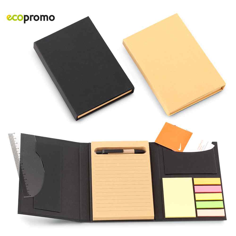 Libreta en cartón, 80 hojas rayadas recicladas. Mini esfero ecológico en cartón. 5 stickies en colores surtidos y 1 taco de papel para tomar notas. Una regla de 12 cm. Un portatarjetas. Medidas: 15.5 cm x 10.5 cm x 1.5 cm. Marca: 5 cm Tampografía. Ficha Técnica
