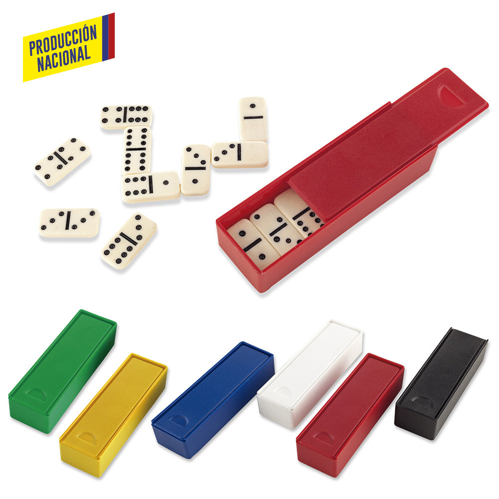 Dominó importado en estuche plástico con tapa corrediza. Medidas: 11.5 cm x 3.5 cm x 2.5 cm Marca: 4.5 cm Tampografía. Con Estuche