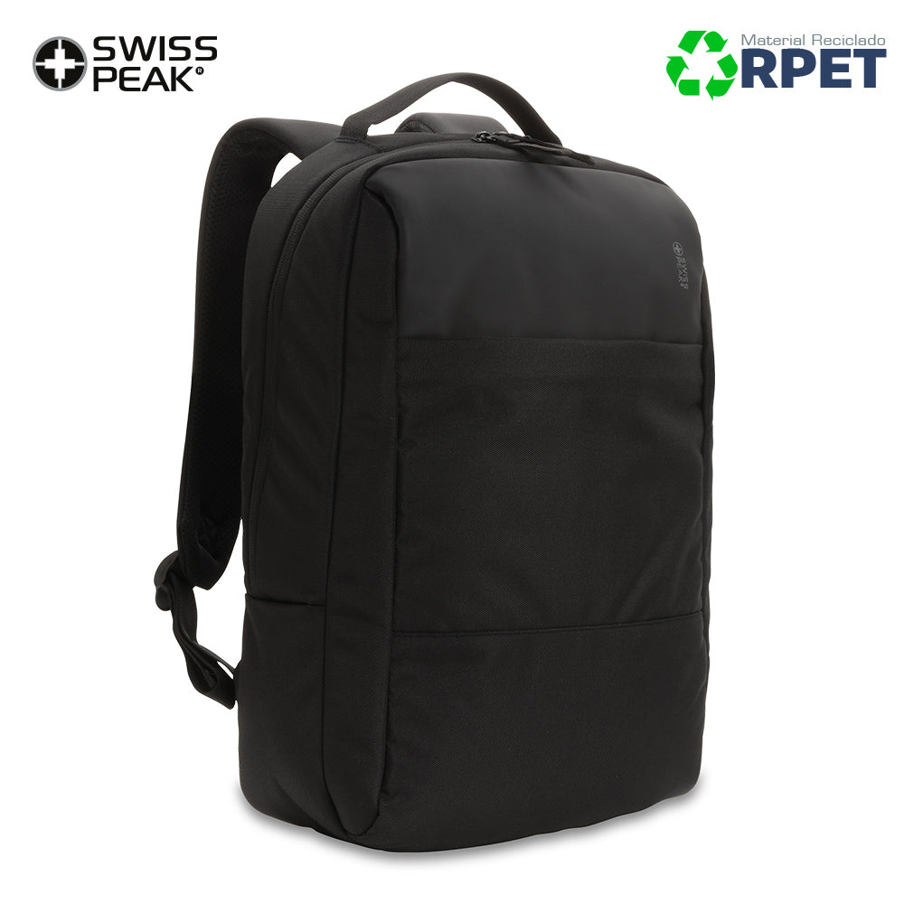 Morral Swiss Peak AWARE ™ elaborado en RPET de 15. Bolsillo frontal con cremallera, bolsillo interior con cremallera y espaldar acolchado. Reata posterior para adaptar a trolley. Medidas: 42 cm x 28.5 cm x 10 cm Marca: 12 cm Screen