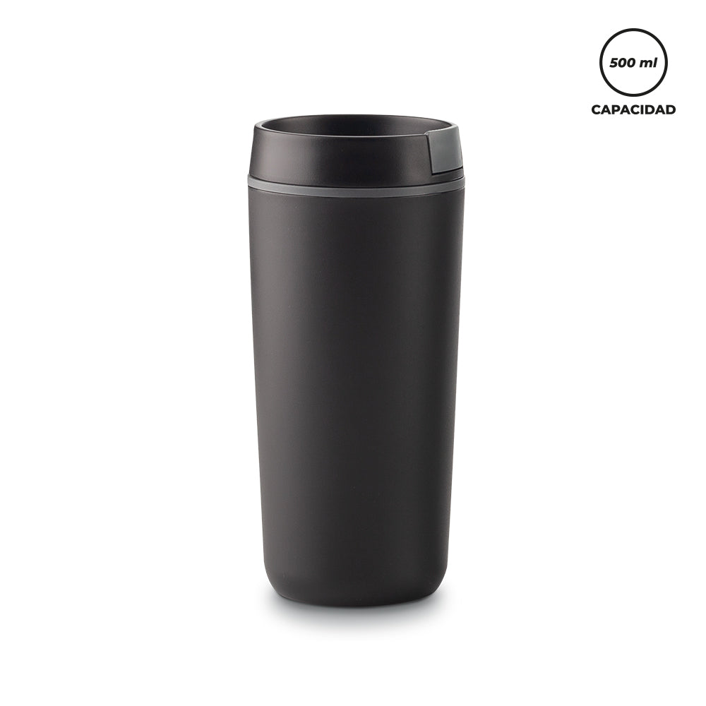 Mug plástico doble pared. Tapa plástica protectora de cierre rosca. Empaque bolsa individual. Medidas: 19 cm x 8 cm diámetro. Marca: 4 cm Tampografía. Ficha Técnica