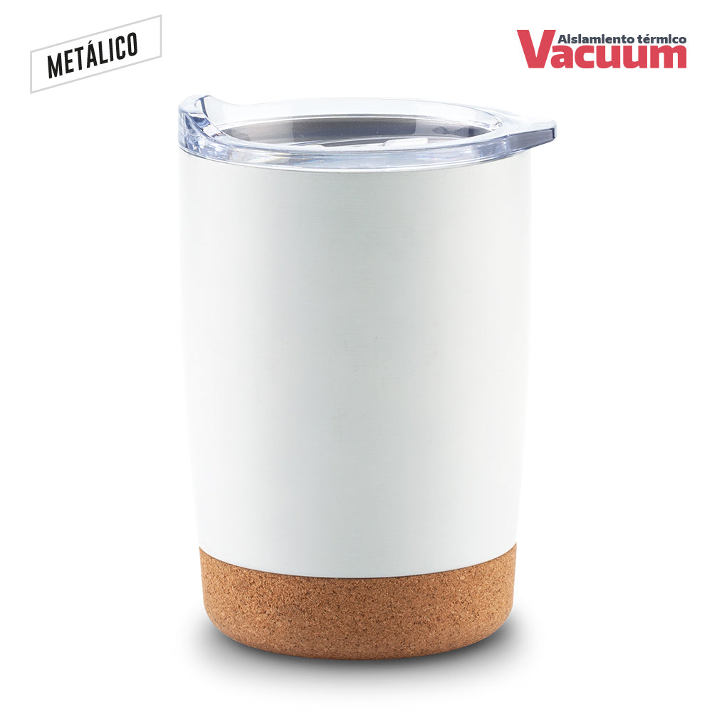 Doble pared en acero Inoxidable y base en corcho, con aislamiento térmico que mantiene la bebida fría entre 8-10h aprox o caliente 3-4h aprox puede variar dependiendo condiciones climáticas. Tapa plástica protectora de cierre a presión, no es tapa de seguridad. Empaque caja individual. Medidas: 12.3 cm x 8.6 cm diámetro superior Marca: 4 cm Tampografía, producto con tratamiento Láser Líquido Oxidante en silver