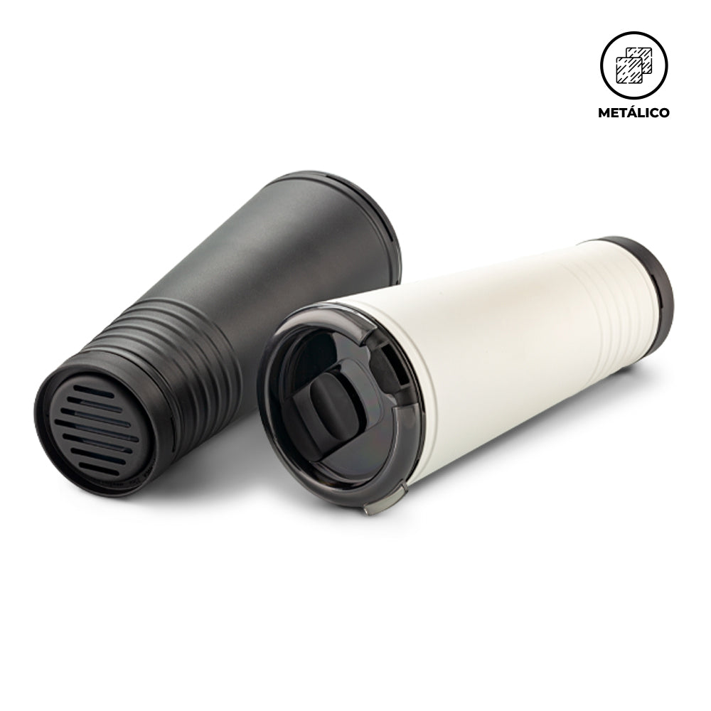 Mug metálico con interior plástico. La tapa es una tapa protectora de cierre a presión, no es de seguridad la cual funciona también como corneta. Medidas: 25 cm x 10 cm x 7cm. Marca: 4.5 cm Tampografía, producto con tratamiento Láser. Ficha Técnica