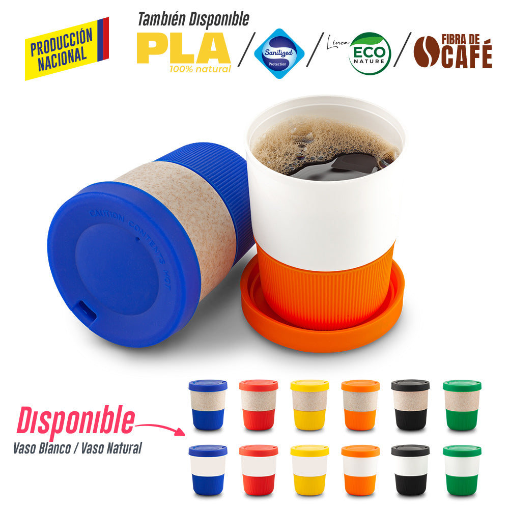 Vaso blanco en polipropileno o vaso natural polipropileno y mezcla con material ecológico en fibra de trigo 50 aprox. El porcentaje de material ecológico tiene un promedio de biodegradabilidad de 2-3 años después del fin de su vida útil. Tapa y base en silicona importada. La tapa es una tapa protectora de cierre a presión, no es tapa de seguridad. Medidas:10.5 cm x 8.5 cm diámetro Marca: 4 cm Tampografía, producto con tratamiento Ficha Técnica. Polipropileno blanco . Polipropileno blanco+Fibra de trigo