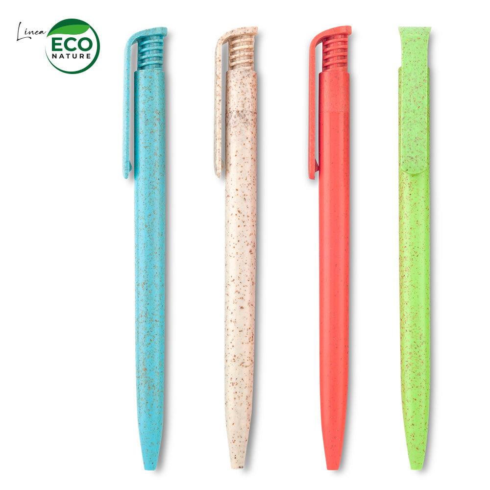 Bolígrafo plástico. Mecanismo push. Mezcla con material ecológico en fibra de trigo 50-60 aprox. El porcentaje de material ecológico tiene un promedio de biodegradabilidad de 2-3 años después del fin de su vida útil. Medidas:14.4 cm Marca:4 cmTampografía Venta mínima y en múltiplos de caja de 50 unidades por color.  **Para el material con contenido de fibra de trigo puede haber variación en el tono de los colores debido a la reacción del tipo de material y los colorantes usados en la fabricación** Ficha Técnica