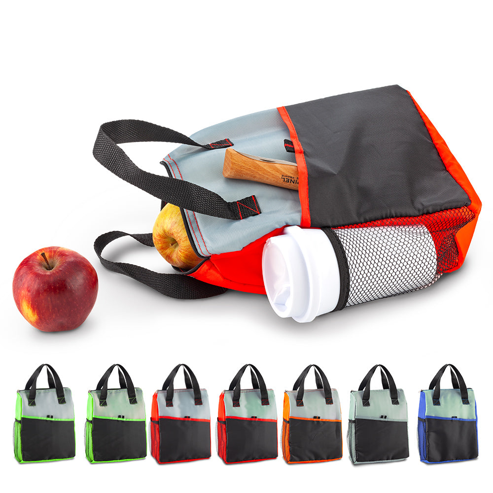 En poliéster, con interior en PVC, bolsillo exterior y malla lateral. Medidas: 20 cm x 28 cm x 7.5 cm Marca: 10 cm Screen NOTA: Este producto es solo para mantener las bebidas frías por cierto tiempo, No mantiene el hielo congelado.