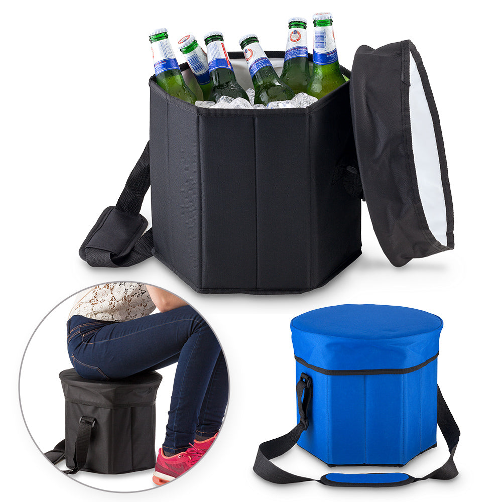 Nevera en poliéster con base interna y tapa que sirve como silla al estar armado y cerrado. Con manija para cargar. Resistencia interna 6 kg, soporta hasta 80 kg de peso al estar sentado siempre que la nevera esté bien armada y con base. Medidas: Incluida la tapa: 26 cm x 30 cm diámetro. Marca: 20 cm Screen NOTA: Este producto es solo para mantener las bebidas frías por cierto tiempo, No mantiene el hielo congelado.