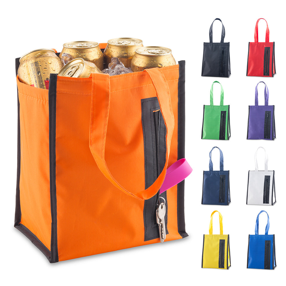 En poliéster. Con bolsillo. Medidas: 20 cm X 26 cm X 14.5 cm. Marca: 9 cm Screen  NOTA: Este producto es solo para mantener las bebidas frías por cierto tiempo, No mantiene el hielo congelado.