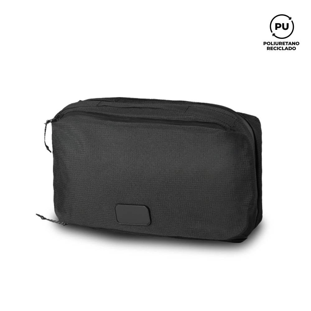 Organizador en poliéster reciclado de residuos plásticos recuperados del océano. Dos bolsillos externos con cremallera. Dos bolsillos internos de malla con cremallera. Gancho para colgar. Medidas: 25 cm x 15 cm x 11 cm. Marca: 3.5 cm Láser incluye placa metálica. VIDEO