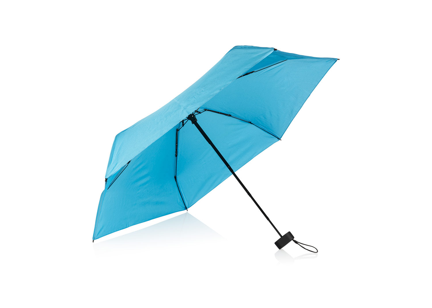 Paraguas mini, perfecto para transportar fácilmente en maletas o bolsos; reversible, de una sección, con apertura y cierre manuales. Varillas en fibra de vidrio y eje metálico de color negro. Incluye estuche negro en EVA con cremallera del mismo color del Paraguas. ParaguasSombrilla. Area impresion: Screen Estuche: 10 cm X 3,5 cm 1 tinta. Screen Paraguas: 22 cm x 10cm.