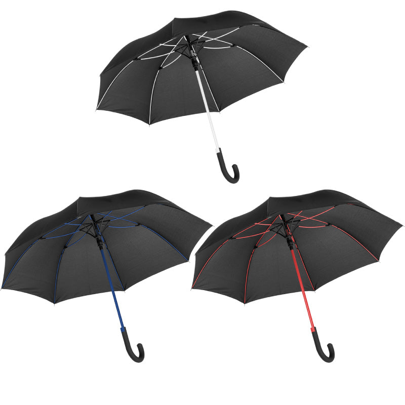 Ø 103 cm. Poliéster Pongee. Paraguas APERTURA AUTOMÁTICA. Eje de metal y varillas de fibra de vidrio de color, puntas metálicas. Mango curvo de goma con botón de color. Cierre con correa de velcro.. Medidas Ancho: 93.0 . Medidas Alto: 19.5 . Medidas Profundidad: 34.5