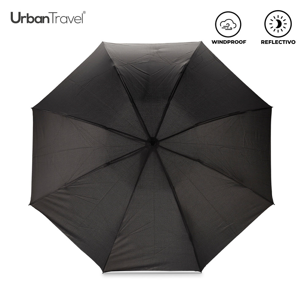 Paraguas plegable en poliéster RPET pongee 190T con herraje en aluminio y bordes reflectivos. Apertura y cierre automático, 8 cascos. Mango tipo carabinero en caucho para poderlo colgar. Incluye funda reciclada RPET. Medidas: Casco: 38 cm x Largo Total: 70 cm x Cobertura: 103 cm. Marca: Máximo 20 cm Screen. NOTA: Abre y cierra de forma reversible para permitir que la parte humeda quede dentro del paraguas y asi evitar gotas de agua.  Ficha Técnica