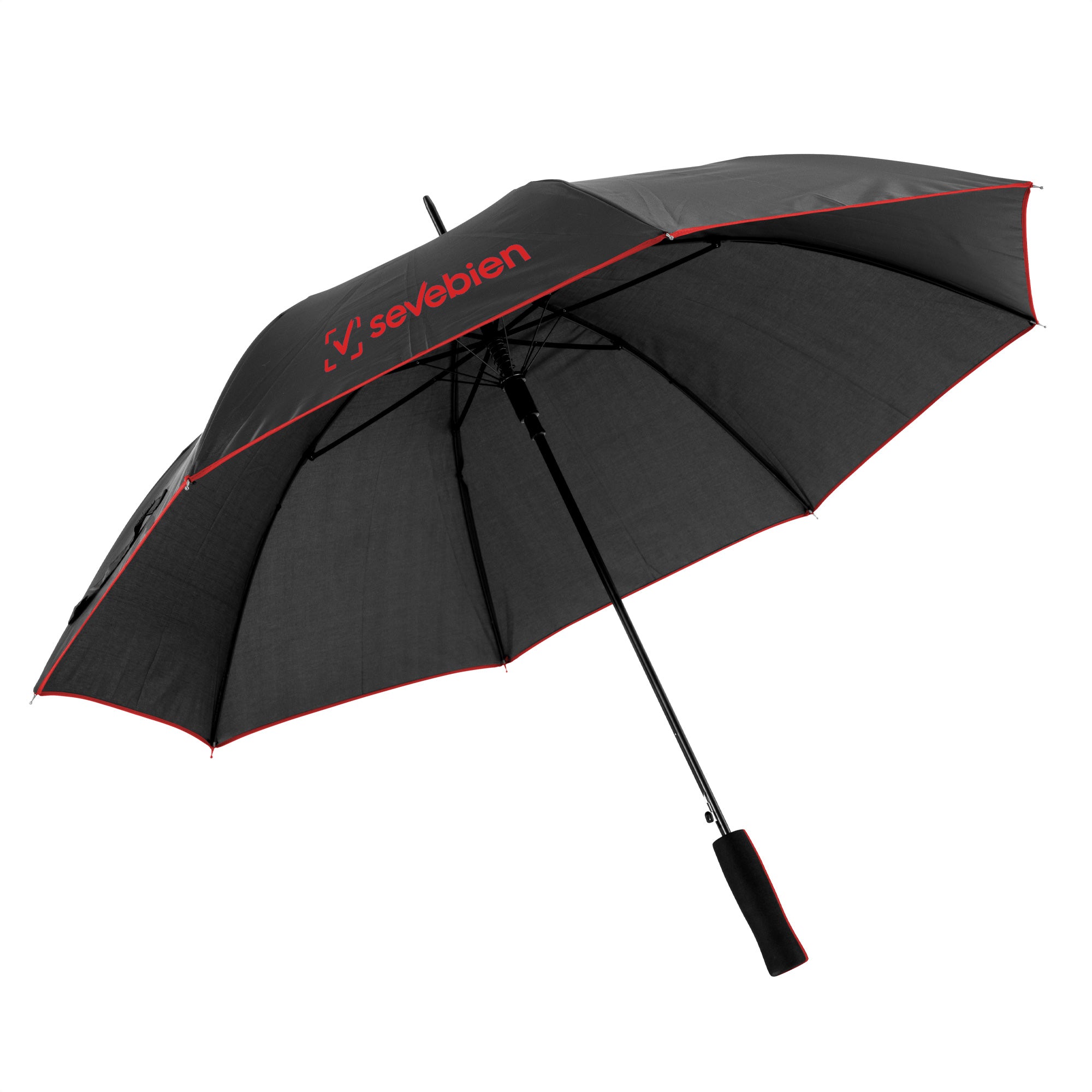 Mantente seco y elegante.Paraguas  APERTURA AUTOMÁTICA Y CIERRE MANUAL. Eje y varillas metálicas. Tela negra con detalle de color. Mango de goma eva de doble color. Botón a presión. Cierre con correa de velcro.Medidas: Ø 105 cm. 8 gajos. Ancho gajo 40 cm. Largo total 83 cm.  Materiales: Poliéster 190T, metal y plástico engomado. . Medidas Ancho: 16.0 . Medidas Alto: 28.0 . Medidas Profundidad: 85.0