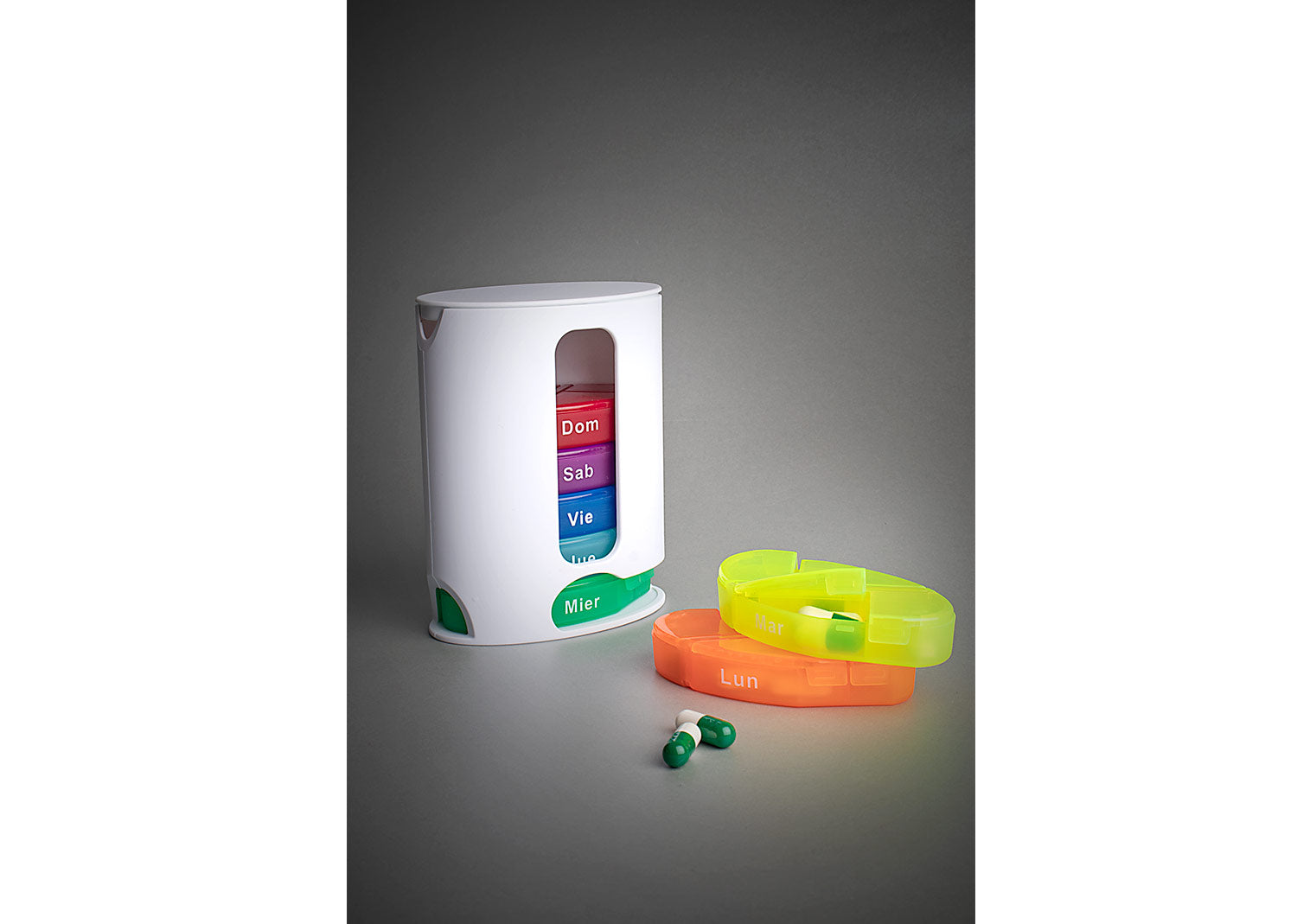 Pastillero semanal de colores con 7 compartimientos asignados para cada día de la semana. Cierre a presión.. Area impresion: Tampo: 2,5 cm