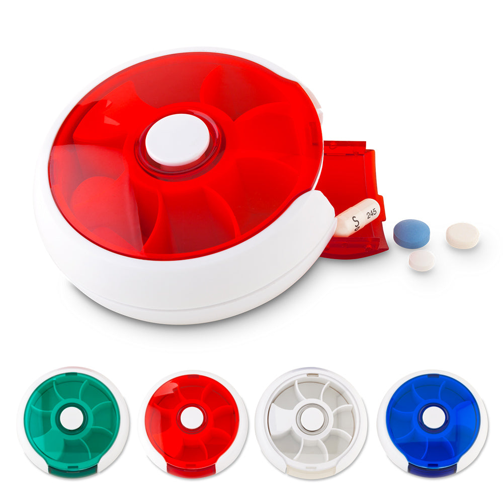 Pastillero plástico giratorio con dispensador. Medidas: 2.8 cm x 9.2 cm diámetro Marca: 3.5 cm Tampografía Ficha Técnica