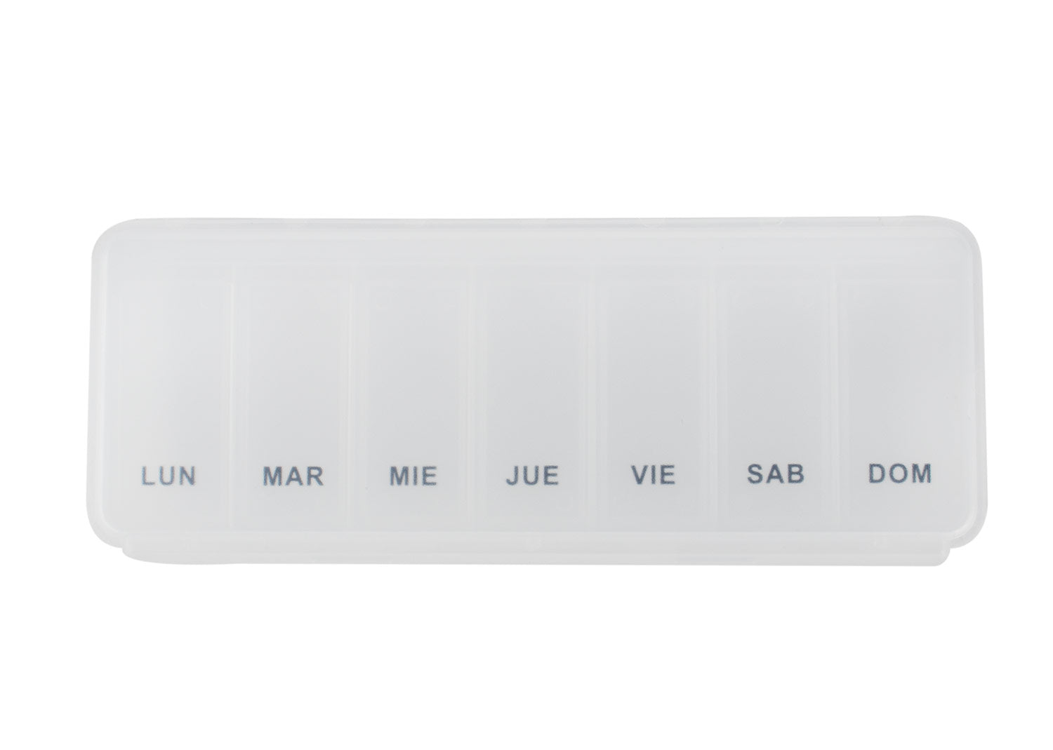 Organizador práctico para medicamentos, diseñado con 7 compartimentos individuales 6,3 X 2,1 para cada día de la semana. Fabricado en plástico transparente con tapa abatible, permite visualizar fácilmente el contenido y mantener el control diario de la dosis. Ideal para uso personal en casa o durante viajes.. Area impresion: Tampo: (7 X 3). . Medidas Largo: 3 . Medidas Ancho: 6.6 . Medidas Alto: 16.9