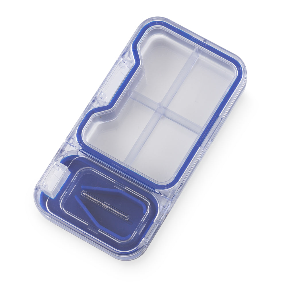 Pastillero plástico con cortador y cuatro compartimientos. Medidas: 12 cm x 6.2 cm x 2 cm. Marca: 3 cm Tampografía. Ficha Técnica