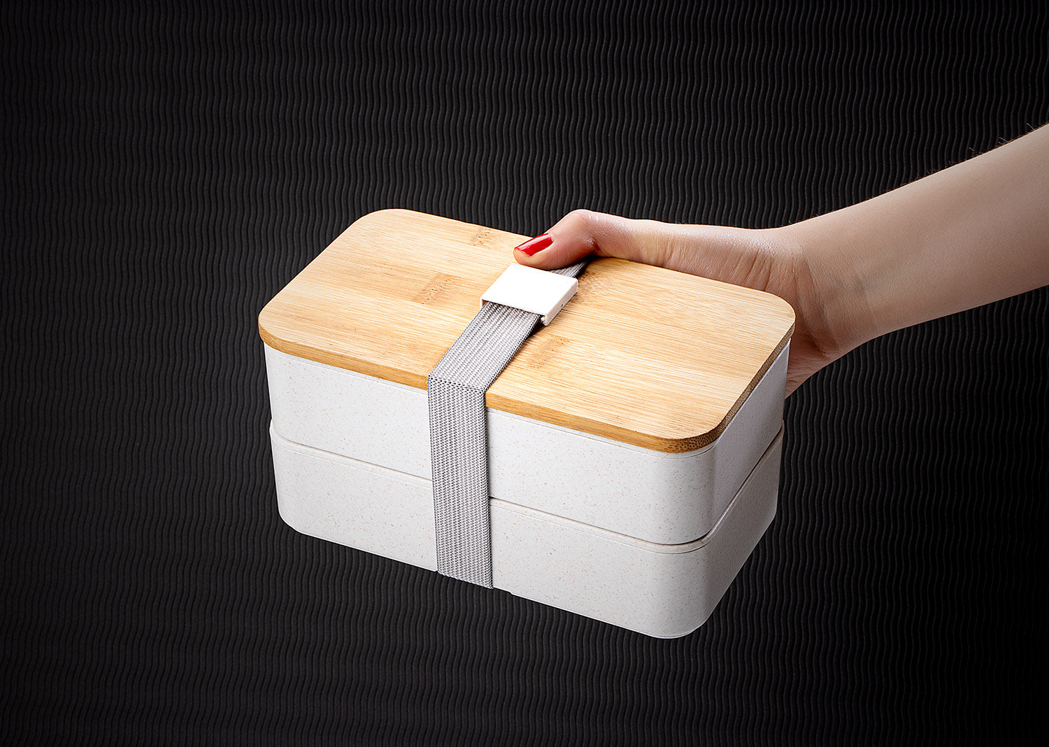 Portacomidas de dos secciones paja de trigo con tapa en bambú y banda en silicona, incluye tenedor, cuchara y cuchillo. Area impresion: Láser: 5x5 cm; Tamaño mas grande consultar asesora. Tampo: 6cm