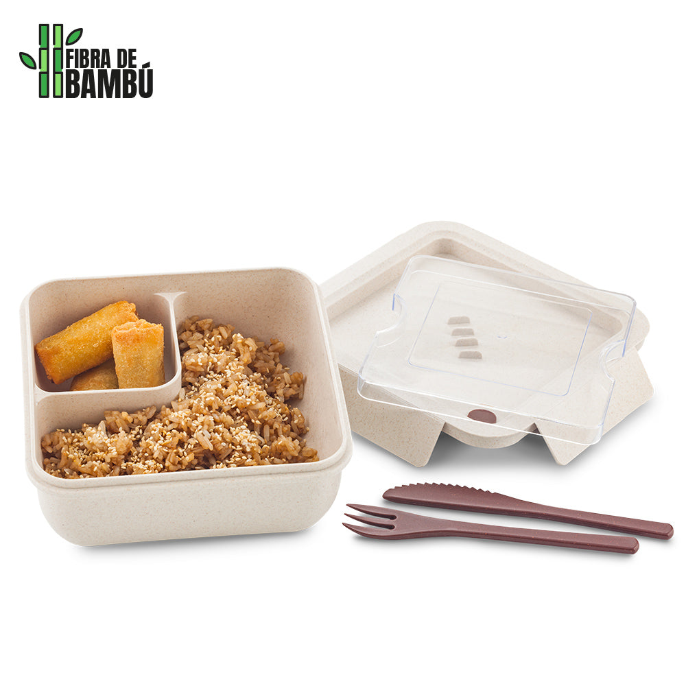 Portacomidas plástico en polipropileno con material ecológico en fibra de bambú. 1000ml capacidad. Set de dos cubiertos. Apto para microondas y máquina lava vajillas retire la tapa transparente superior y los cubiertos. Medidas: 17 cm x 17 cm x 7 cm Marca: 5.5 cm Tampografía Ficha Técnica