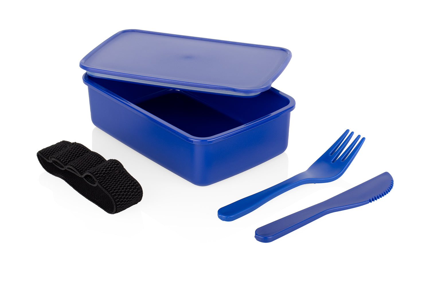 Portacomidas rectangular con banda de seguridad negra. Incluye cuchillo y tenedor.. Area impresion: Tampo: 7 X 4,5 cm en la tapa . Medidas Largo: 16.50 . Medidas Ancho: 11.00 . Medidas Alto: 5.00