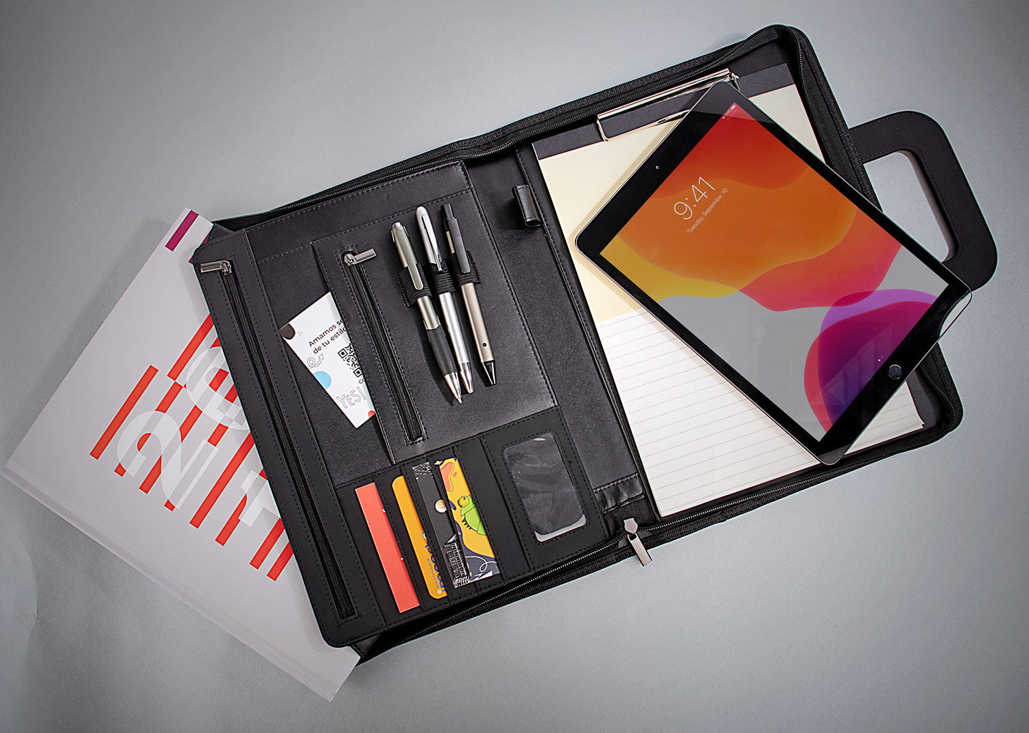 Portafolio en PU, con bloc de notas papel blanco con 30 hojas rayadas, gancho legajador metálico, dos agarrraderas que se ocultan y permiten transportar facilmente, multiples bolsillos para organizar tarjetas de presentación, bolígrafos, calculadoras, bolsillo prinicipal para guardar portatil o tablets de 12. Area impresion: Láser: Grabado placa 4x1,5 cm. Screen: 15 cm de ancho x 6 cm de alto . Medidas Largo: 5.00 . Medidas Ancho: 33.00 . Medidas Alto: 35.00