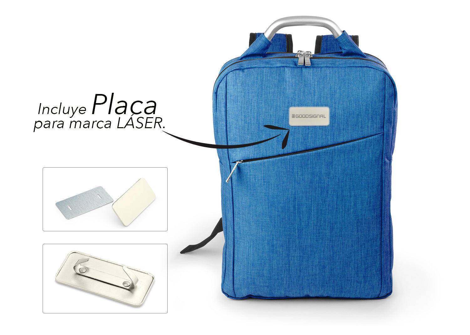 Morral con agarradera en Aluminio y cargaderas acolchadas, 2 bolsillos principales con doble cremallera, uno con compartimento con velcro para portátil de 14 y el otro con bolsillo interior para bolígrafo y libreta. Bolsillo frontal con cierre de cremallera. Incluye placa metálica para marca láser. Volumen aproximado: 14 litros.. Area impresion: Portalaptop: 15 x 15 cm. Plaqueta metálica: 5 x 2 cm. . Medidas Largo: 11.50 . Medidas Ancho: 29.00 . Medidas Alto: 41.00