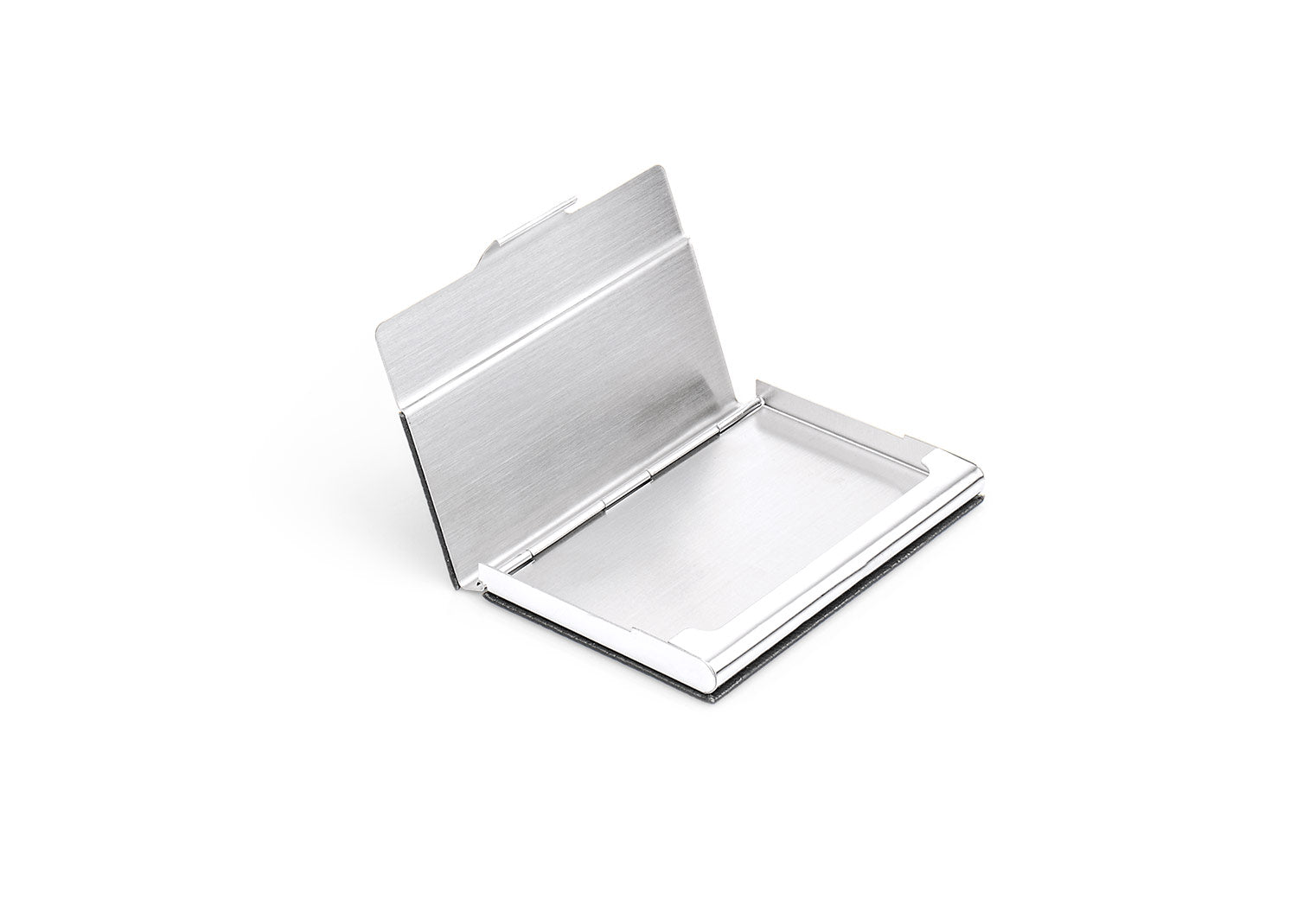 Portatarjeta Metálico con cubierta en cuero reciclado, cierre a presión.. Area impresion: Láser: Tarjetero: 5x1 cm. Tampo: 5cm . Medidas Largo: 9.50 . Medidas Ancho: 6.00 . Medidas Alto: 1.00