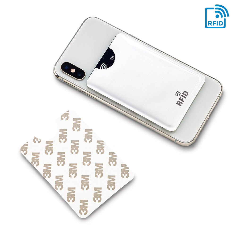 Portatarjetas de un compartimento, elaborado en material laminado y aluminio en el interior. Su material interno permite bloquear las senales electromagneticas RFID Radio Frequency Identification que se usan en tarjetas de chip, tarjetas electronicas de transporte, etc. Con adhesivo 3M para pegar en la parte posterior del dispositivo movil. Medidas: 9 cm x 6.2 cm Marca: 5 cm Tampografia Venta minima y en multiplos de 10 unidades Nota Importante: Debe limpiar muy bien la superficie del dispositivo antes de pegar el soporte y que este completamente seca, no pega en superficies porosas, deben ser completamente lisas. Adherir y presionar firmemente por tres minutos, luego dejar reposar como minimo una hora antes de su uso.