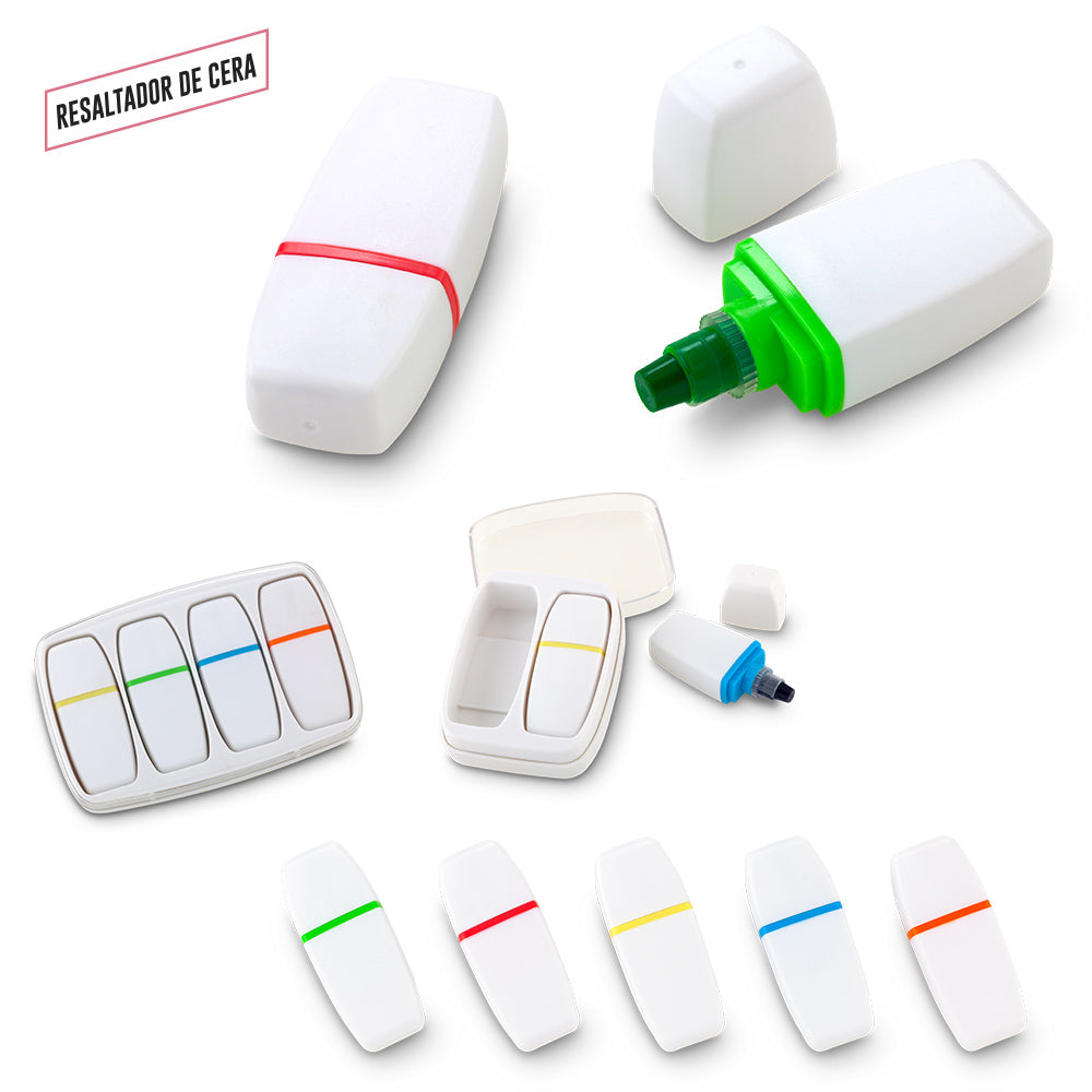 Mini resaltador plástico en cera. No se seca. Medidas: 5.5 cm x 2 cm x 1.2 cm Marca: 2 cm Tampografía Ver opciones de estuche: OF-456-2 OF-456-4 Producto con condiciones especiales de alistamiento,consulte con su asesora el tiempo de entrega. Ficha Técnica. Resaltador por Unidad