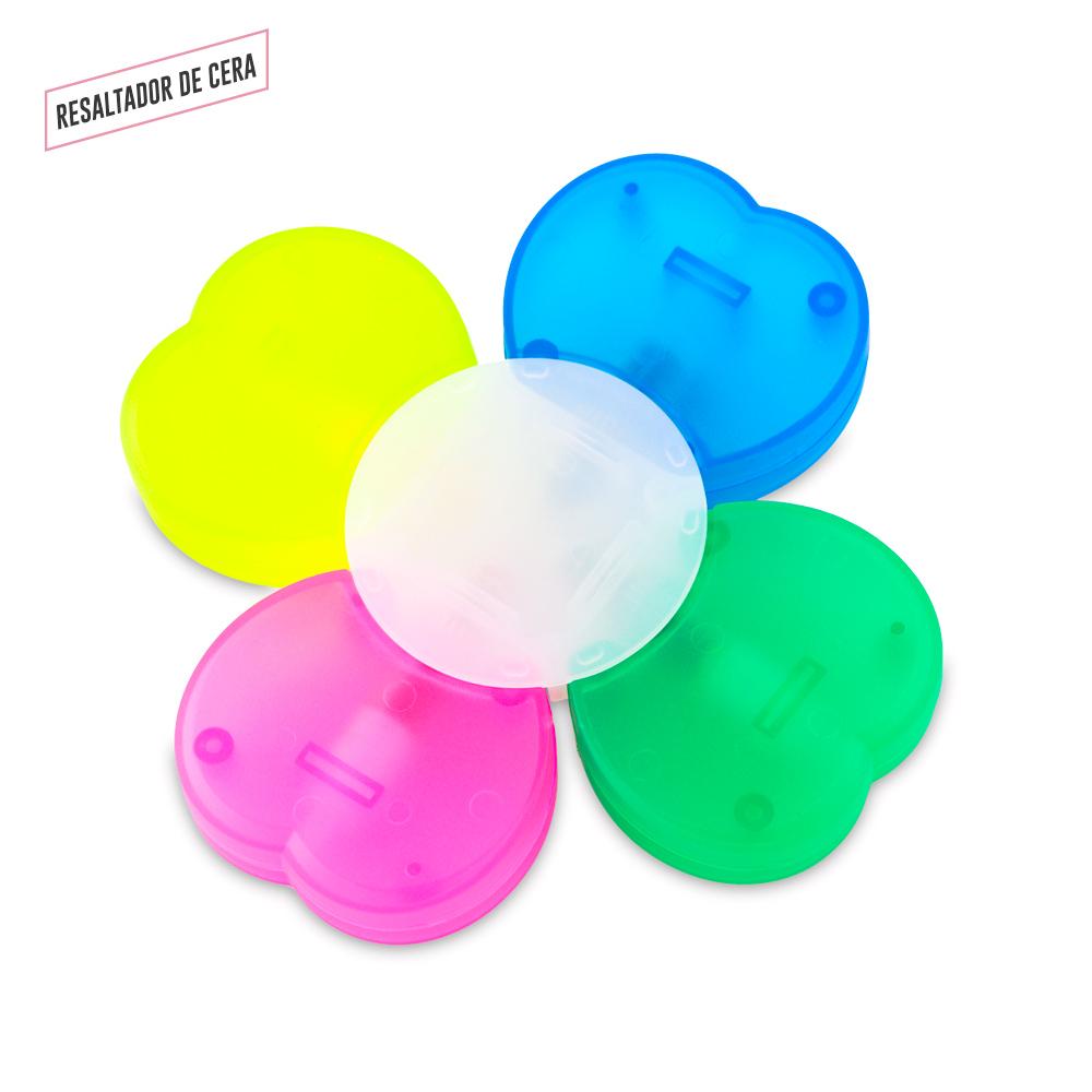 En plástico con 4 resaltadores de cera en colores. No se seca. Medidas: 11 cm x 11 cm Marca: 4.5 cm Tampografía Ficha Técnica