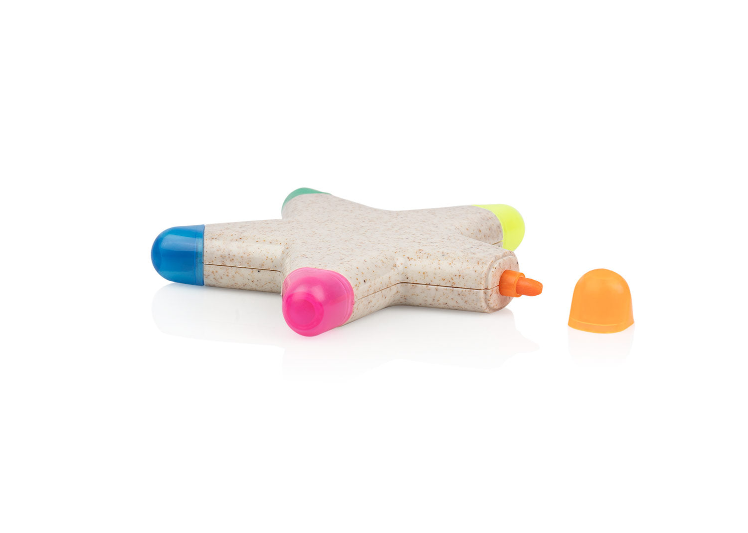 Resaltador con forma de estrella, con 5 colores de tinta: azul, verde, amarillo, naranja y rosado. Elaborado con paja de trigo.. Area impresion: Tampo: 3 cm x 2 cm . Medidas Largo: 9.7 . Medidas Ancho: 9.7 . Medidas Alto: 1.9