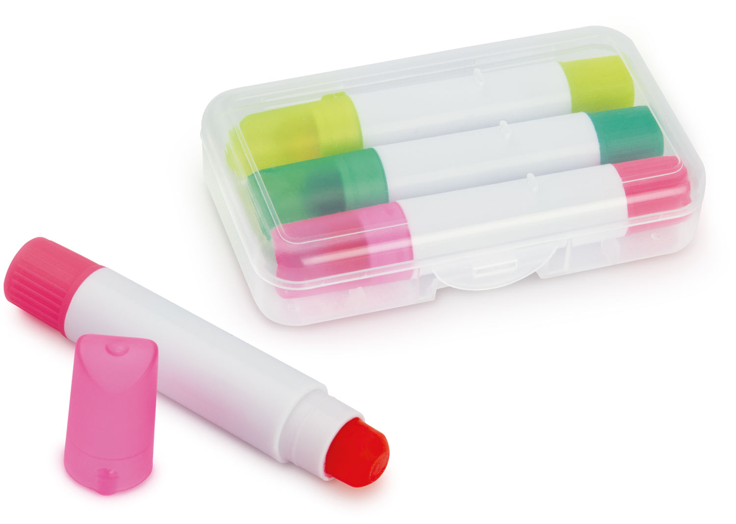 Set de resaltadores en parafina, en colores: verde, amarillo y rosado. Sistema Twist. No se seca.. Area impresion: Estuche: Digital: 7 x 3,5 cm. Tampo: 6 x 3,8 cm. . Medidas Largo: 2.00 . Medidas Ancho: 8.70 . Medidas Alto: 5.00