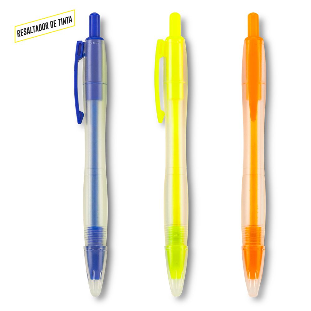 Resaltador plástico de tinta con tapa. Mecanismo push. Medidas: 15 cm Marca: 3.5 cm Tampografía Venta mínima y en múltiplos de caja de 50 unidades.  Ficha Técnica