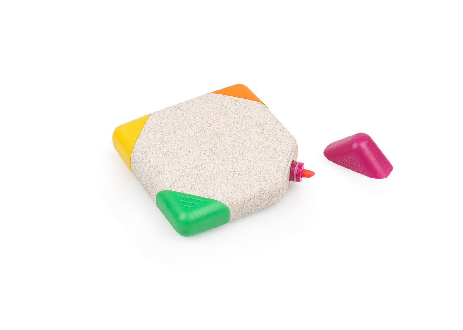 Resaltador con forma cuadrada, con 4 colores de tinta: verde, amarillo, naranja y rosado. Elaborado con paja de trigo.. Area impresion: Tampo: 5,5 cm x 3 cm . Medidas Largo: 8 . Medidas Ancho: 8 . Medidas Alto: 1.9